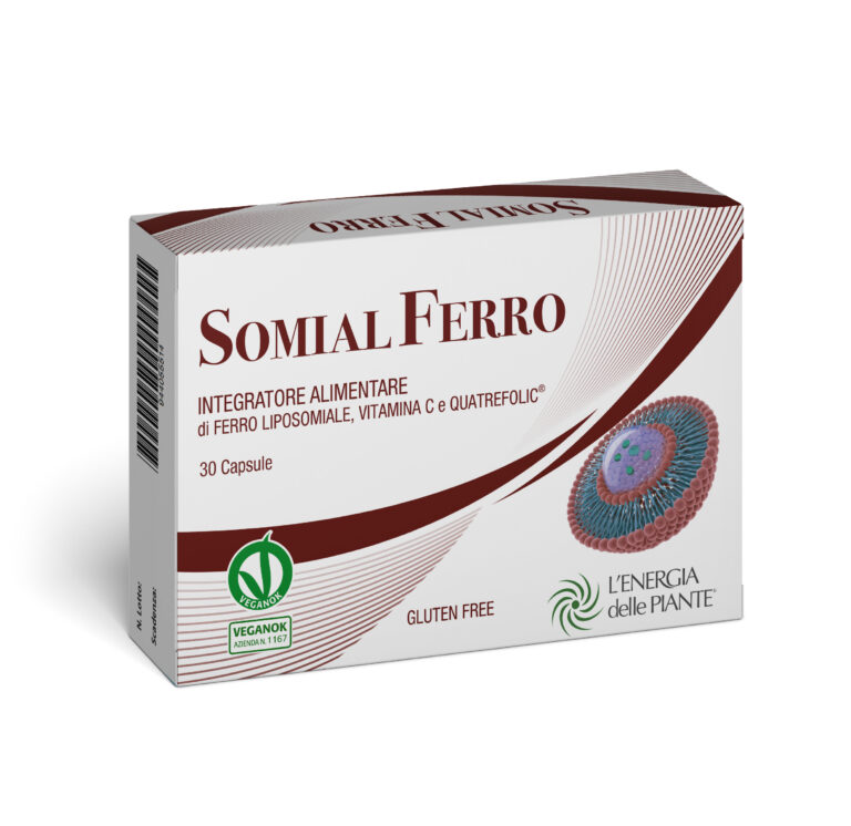 Somial Ferro capsule è un integratore alimentare a base di Ferro in liposomi (Lipofer®), Vitamina C ed Acido Folico, utile per colmare le carenze alimentari o gli aumentati fabbisogni organici di tali micronutrienti. SOMIAL FERRO ® è un integratore alimentare a base di Ferro Liposomiale microincapsulato e Vitamina C Liposomiale, utile per colmare le carenze alimentari o gli aumentati fabbisogni organici di questo micronutriente. Cos’è un liposoma? Un liposoma è una struttura vescicolare di forma sferica composta da uno o più doppi strati di natura fosfolipidica. L'immagine illustra la composizione di un semplice liposoma composto da un doppio strato fosfolipidico monolamellare. La formazione e la struttura dei liposomi è dovuta alla natura anfifila (con regioni idrofile e idrofobe) dei fosfolipidi che lo compongono, le cui regioni omologhe si legano in un mezzo acquoso, quindi è  essenzialmente un processo meccanico di idratazione dei fosfolipidi. Quando il composto incapsulato è solubile in acqua, si posiziona all'interno della struttura mentre nel caso di un composto idrofobo si posizionerebbe nella membrana liposomiale. La produzione dei liposomi avviene attraverso i seguenti processi: 1) Evaporazione in fase inversa 2) Ultrasuoni di fosfolipidi emulsionati 3) Microfluidificazione I processi di produzione così come la scelta dei costituenti del liposoma sono fattori molto rilevanti che determinano l'efficienza della microincapsulazione, le caratteristiche della membrana nonché la struttura e le dimensioni liposomiali. La sospensione ottenuta con tale procedimento può essere liofilizzata per ottenere microcapsule in polvere. Questo processo innovativo ha suscitato grande interesse grazie alla possibilità di progettare liposomi "custom" con molteplici funzioni che fungono da veicoli per i principi attivi. Lo scopo della modulazione dei liposomi attraverso l'uso di fattori quali temperatura, pH, potenziale redox o affinità per uno specifico recettore è ottimizzare l'efficacia e la specificità degli attivi nel sito d'azione. I farmaci liposomiali godono di un'ottima accettazione, essendo accettati per la produzione di prodotti antivirali, antibiotici, enzimi, integratori alimentari e vaccini. ASSORBIMENTO E BIODISPONIBILITA' DEI SOMIAL FERRO ® Il composto pirofosfato ferrico contenuto in SOMIAL FERRO ® è incapsulato in un liposoma con una struttura composta da un doppio strato fosfolipidico ricco di lecitina. La tecnica della microincapsulazione del ferro produce liposomi molto stabili con la capacità di resistere all'acidità gastrica, che gli permette di raggiungere l'area intestinale nella sua interezza. In questo modo si previene la comparsa di disturbi gastrici dovuti all'azione pro-ossidante del ferro libero contenuto in altri sali di ferro convenzionali. Una volta superata la barriera gastrica, SOMIAL FERRO ® raggiunge l'intestino tenue dove viene  completamente assorbito da un tipo specifico di cellule epiteliali chiamate cellule M. I VANTAGGI DEL SOMIAL FERRO ® SONO: Contiene ferro liposomiale ad elevata biodisponibilità e assorbimento; Effetti collaterali (ES) Non provoca fastidi gastrici o reflusso poiché viene assorbito nel duodeno; Contiene vitamina C Liposomiale, il più potente facilitatore dell'assorbimento del ferro; Il suo incapsulamento liposomiale e il suo alto contenuto di fibre prevengono la comparsa della stitichezza; Il suo pratico formato in polvere che può essere assunto direttamente senza bisogno di acqua; Non lascia un sapore metallico dopo il consumo, un problema molto comune in altri integratori di ferro; Un fantastico sapore di fragola lo rende più piacevole, soprattutto per i bambini; La sua ottima tollerabilità migliora notevolmente l'aderenza alla terapia. no assorbiti completamente e direttamente nell'intestino. SOMIAL FERRO ® BIODISPONIBILITA' Uno studio comparativo dell'assorbimento e della biodisponibilità del ferro in SOMIAL FERRO ® è stato effettuato con altri sali di ferro contenuti in altri prodotti commercializzati. Lo studio ha rivelato che sia l'assorbimento che la biodisponibilità del pirofosfato ferrico contenuto in SOMIAL FERRO ®sono notevolmente superiori a quelli presentati dagli altri composti di ferro utilizzati nel confronto. L'assorbimento di SOMIAL FERRO ® È risultato essere da 2 a 4 volte superiore rispetto ad altri sali come pirofosfato ferrico libero, solfato ferroso o gluconato di ferro, il che conferma la stabilità e l'efficacia del ferro liposomiale contenuto SOMIAL FERRO ®.